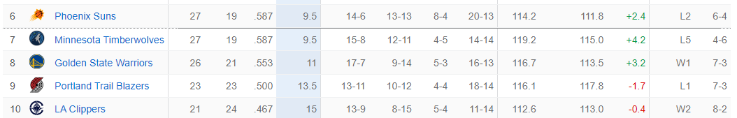 快船目前21胜24负,太阳27胜19负,快船距离西部第六也只有4.5个胜场,感觉快船本赛季依旧有希望去冲击西部前六,勇士、开拓者、森林狼等球队被快船反超感觉只是时间问题。
